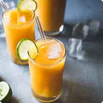 вода, пюре банана и манго, мёд, сок апельсиновый, сахарный сироп, мускатный орех, листья кинзы