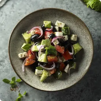 томат черри, сладкий перец, огурец, красный лук, сыр Фета, маслины, заправка