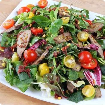 Куриная печень, мука, соль, перец,томат, лук красный, айсберг, перец болгарский, кинза, руккола, салатная заправка