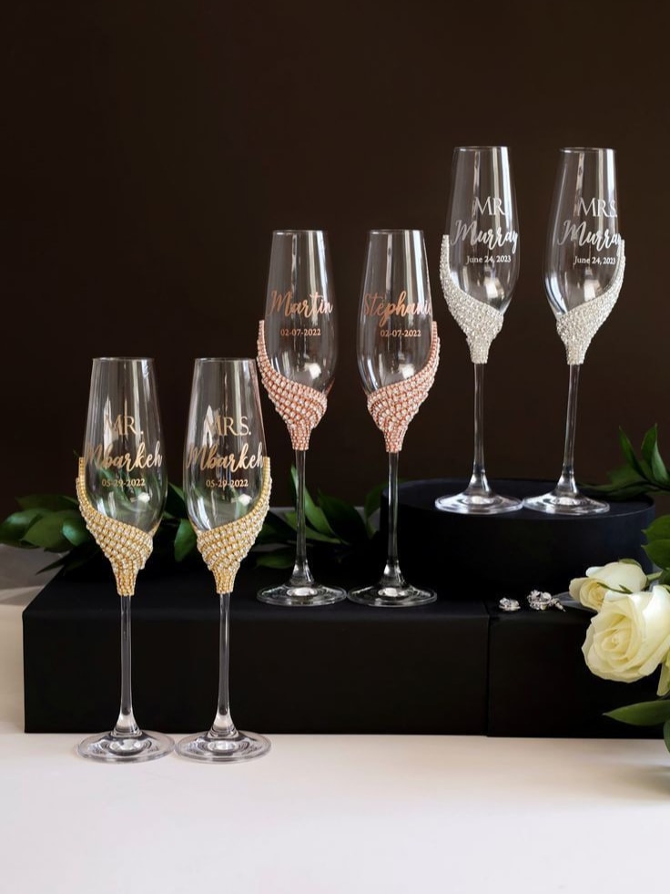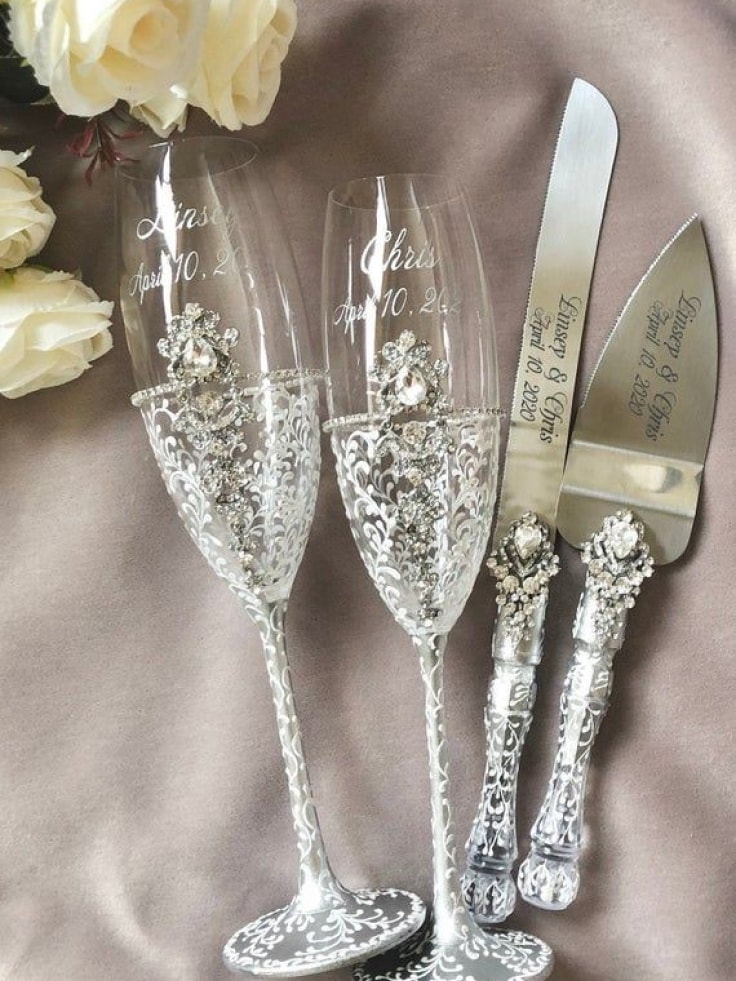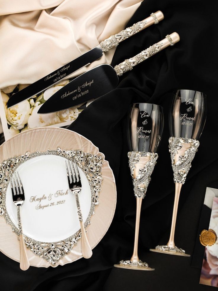 Флейты для шампанского для жениха и невесты, тарелка и вилки от 350 руб.
